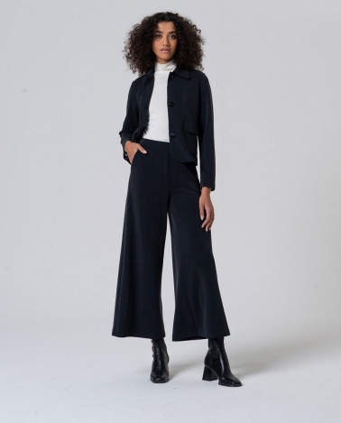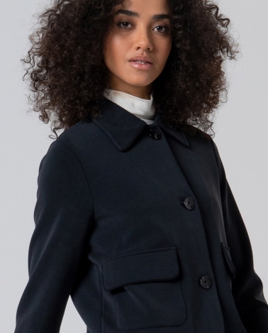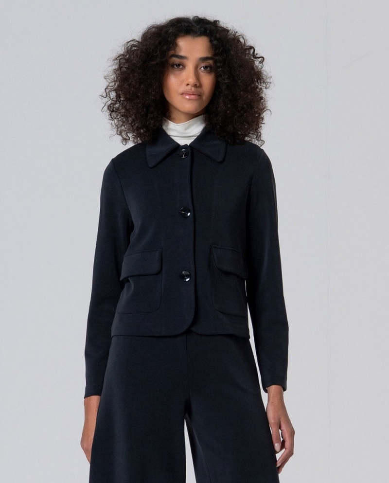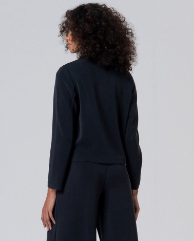 Chaqueta corta en tejido de modal de color negra . Con bosillos delnteros con tapa, botones forrados y cuello camisero .