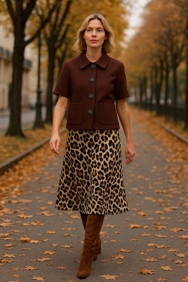 Chaqueta de punto de manga corta , con botones fantasia marrón y cuello camisero . Bolsillos plastones . COMPOSICIÓN: 95% VISCOSA 5% ELASTAN.