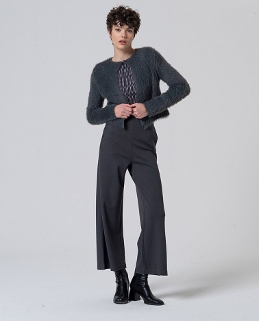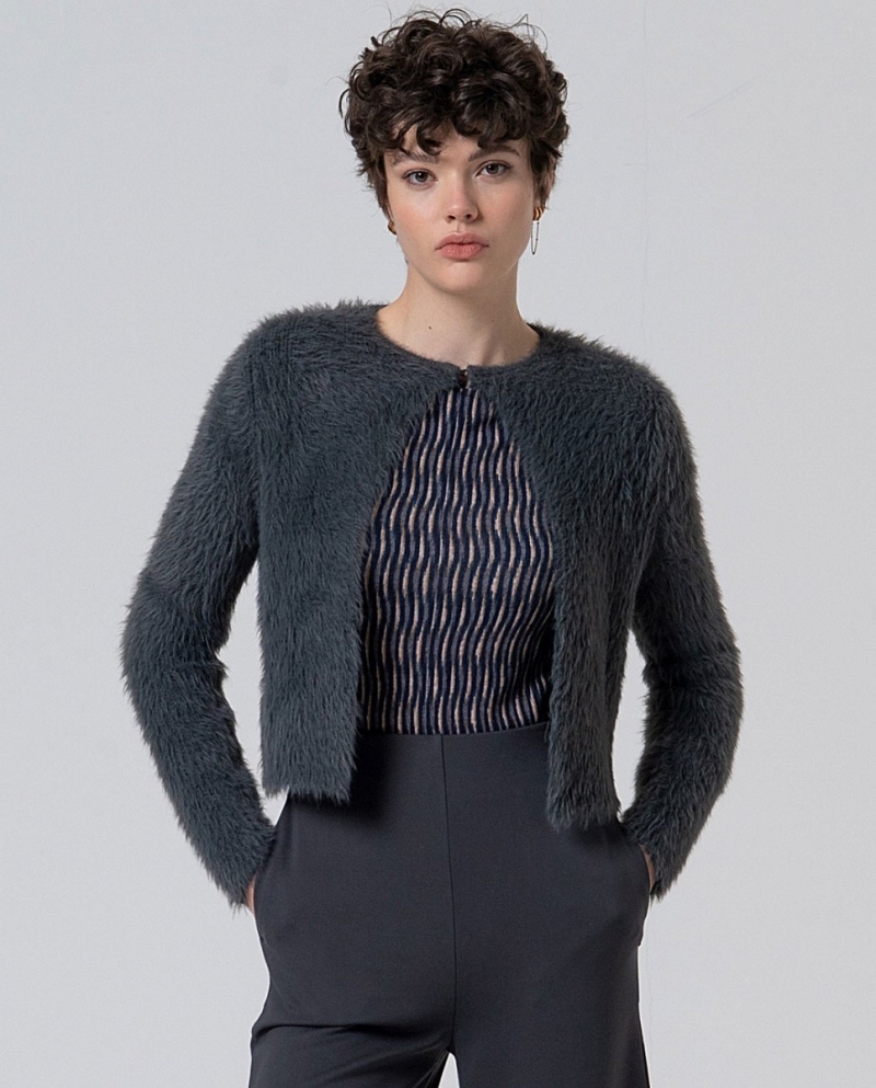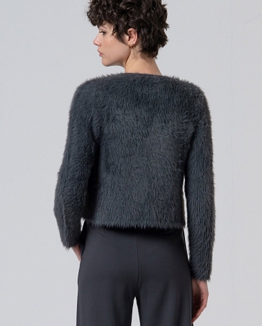 Chaqueta de tricot con efecto pelo , cierre de corchete en el cuello , de color gris .