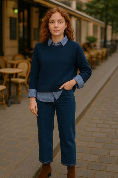 Jersey de punto con detalle de camisa a rayas en color azul marino , una prenda funcional y versatil , para este otoño -invierno . Composición: 70% poliester 15% poliamida 8% acrilico 5% lana 2% elastan .
