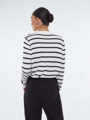jersey de lana marinero de manga larga , con strass en el escote , de color blanco con rayas negras .
