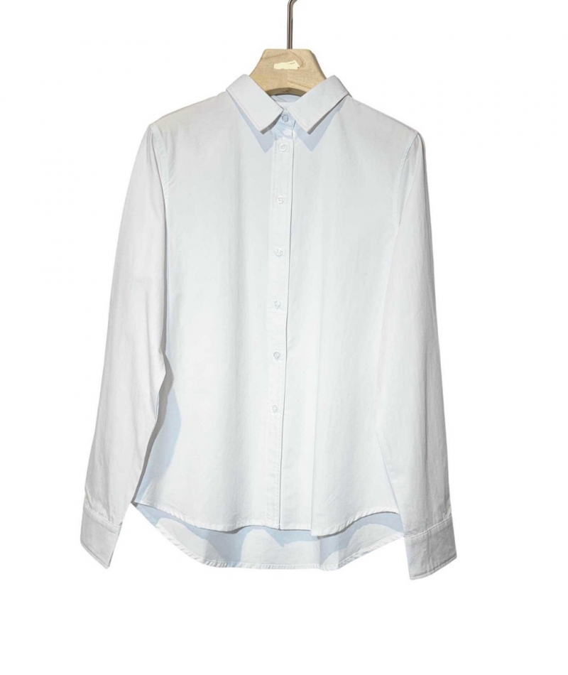 Camisa blanca elástica basica de manga larga y cuello camisero.