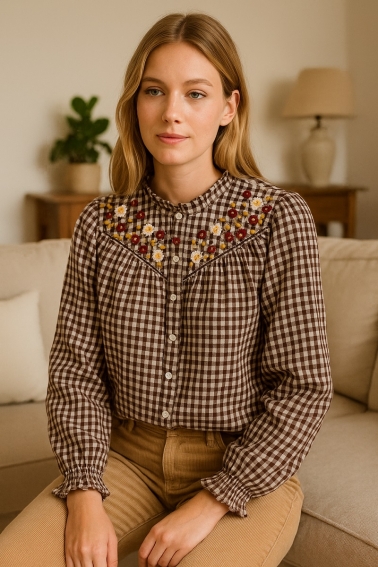 Camisa de cuadros color chocolate y parte superior con flores bordadas , cuello maho, con volante tanto en cuello como en puños .Una camisa con aire romántico. Composición: 100% algodón.