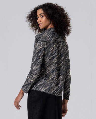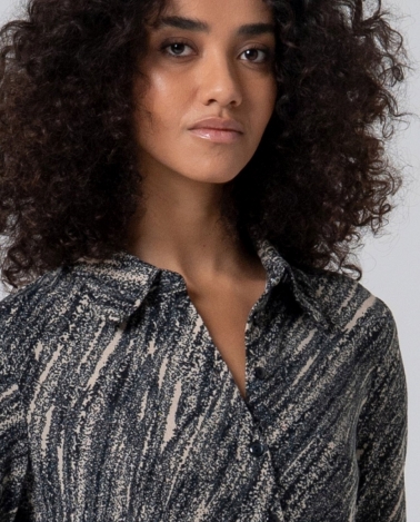 Camisa elástica estampada con fondo negro , cuello camisero y manga larga . Composición : 50%Poliéster Reciclado 46%Viscosa 4%Elastano
