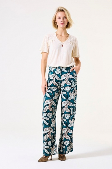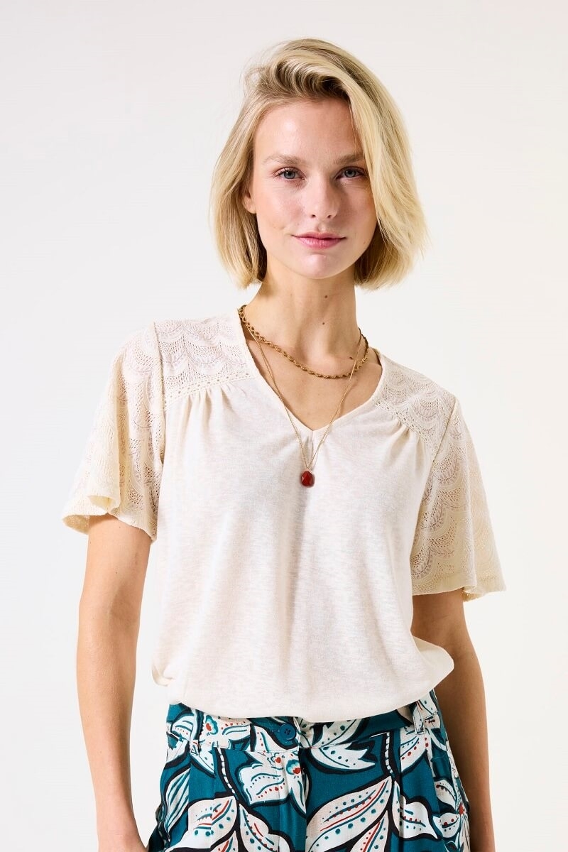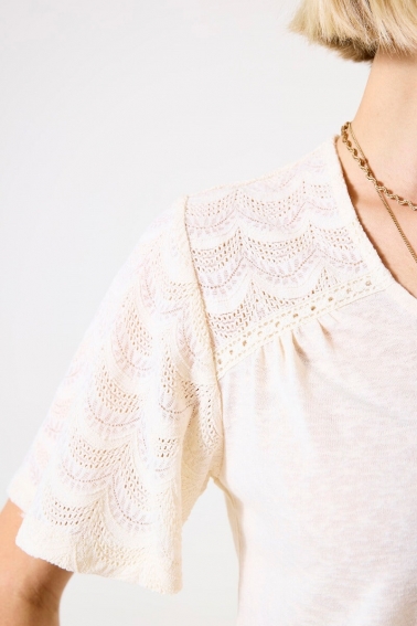Camiseta con detalles calados. Una prenda moderna y fácil de combinar. Esta camiseta tiene manga corta, cuello en V y corte regular