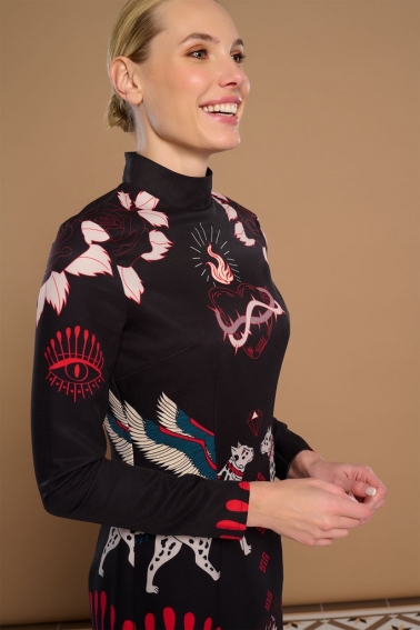 Vestido corto elástico con estampado etnico , cuello maho y manga larga .